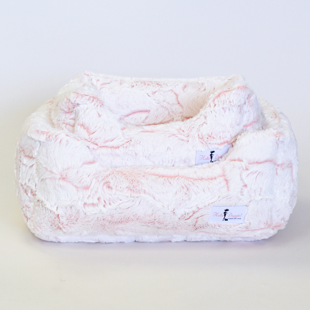 The Whisper Collection by Hello Doggie features high-quality soft fabric dog beds. This bed features a white fabric with a fluorescent tone peeping through. These soft-to-the-touch beds will have your pup snoozing away and cuddly wrapped in an ultra-soft matching dog blanket.  Dimensions Small Bed - 10" x 7"    |    For dogs up to 4 lbs MSRP - $99.99 Large Bed - 14" x 10"  |     For dogs up to 10 lbs MSRP - $119.99 *Bed is handmade and sizes may vary slightly. Made in USA.
